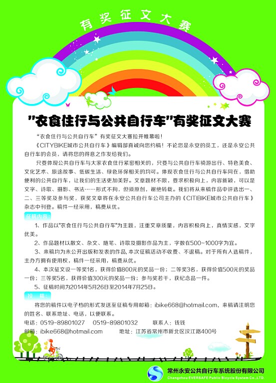 只要體現(xiàn)公共自行車與大家衣食住行緊密相關(guān)的,只要與公共自行車騎游出行、特色美食、文化藝術(shù)、旅途故事、低碳生活、綠色環(huán)保相關(guān)的均可。體現(xiàn)衣食住行與公共自行車同在,借助便利的公共自行車,讓我們的生活更加美好。文章題材不限,要求積極向上,內(nèi)容新穎,可以是文字、詩歌、攝影、書法……形式不拘,但須原創(chuàng),謝絕轉(zhuǎn)載。我們將從來稿作品中評選出一、二、三等獎及參與獎,獲獎文章將在永安公共自行車公司主辦的《citibike城市公共自行車》雜志中刊登。稿件一經(jīng)采用,稿費從優(yōu)。