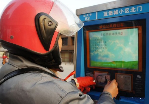 上午8時(shí)10分,李莉的手機(jī)又響了,是總部調(diào)度中心工作人員的電話。通知她阜陽職院東門的公共自行車站點(diǎn)滿樁,請(qǐng)她速去處理。掛完電話,李莉匆忙趕到站點(diǎn),已經(jīng)有兩位要存車的市民等候在此。李莉趕忙騰出足夠的“車位”,但由于高峰期時(shí)騰出的車位陸續(xù)有市民來還車,所以卸車的工作也在不斷重復(fù)?!耙舫鰜硪恍┛諛豆┦忻襁€車,多余的自行車通過總部調(diào)度重新分配到其他站點(diǎn)?!?李莉?qū)⒍嘤嗟淖孕熊嚢凑找徽环吹捻樞蛲7耪军c(diǎn)旁,用軟鋼繩拴在一起。然后在公共自行車查詢終端刷下工作卡,將備車數(shù)量輸入自助查詢系統(tǒng),上報(bào)終端。工作了近一個(gè)月,李莉?qū)ρ矙z員的工作已經(jīng)非常熟練。
