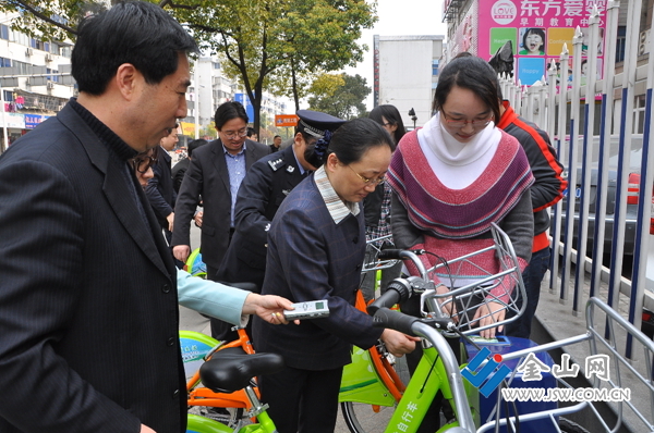 在大市口廣場上,朱曉明、雷志強一行首先閱讀了標注有公共自行車使用方法和車位分布圖的展牌。朱曉明要求市城管部門更廣泛地宣傳使用方法和車位分布圖,讓更多市民知曉,并在試運行的一個月中及時聽取他們的意見和建議,隨時加以改進,以便5月1日正式運行時給市民帶去更多方便。隨后,朱曉明、雷志強及有關(guān)部門負責人來到位于房產(chǎn)交易中心外的車位上各自取了一輛自行車騎上了解放路。