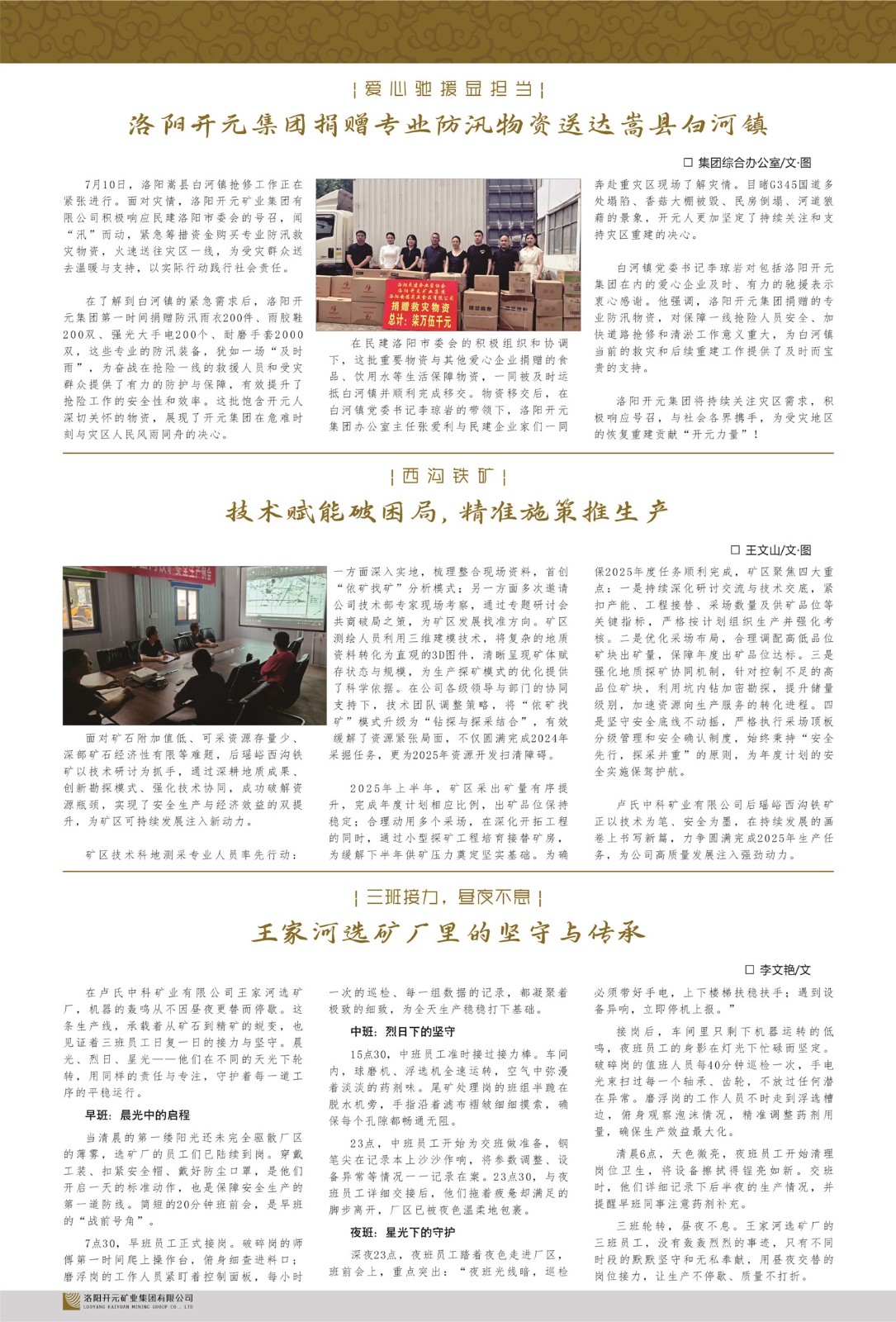 洛陽開元礦業(yè)集團有限公司簡介洛陽開元礦業(yè)集團有限公司,始成立于2006年,位于洛陽市開元大道269號。集團旗下共有十余家全資子公司,業(yè)務涉及有色金屬礦山開發(fā)、礦產(chǎn)品購銷與進出口貿(mào)易、房地產(chǎn)開發(fā)、文化藝術、企業(yè)管理與咨詢、資本投資等多個領域。2024年,集團公司銷售總額達7.8億元。民建河南省委委員、民建河南省委企業(yè)委副主任、民建洛陽市委委員、企業(yè)委主任、洛陽民建企業(yè)家協(xié)會會長許明月是公司創(chuàng)始人,現(xiàn)任洛陽開元礦業(yè)集團有限公司董事長。在礦業(yè)領域,洛陽開元礦業(yè)集團擁有多家實力雄厚的子公司:貴州開元礦業(yè)有限公司探、采礦權面積共11.33平方公里;興海縣銅鑫礦業(yè)有限公司探礦權面積8.76平方公里,礦山資源潛力巨大;2021年,開元集團與盧氏中科礦業(yè)有限公司開展戰(zhàn)略合作。盧氏中科礦業(yè)有限公司專注于有色金屬的浮選、加工和銷售,擁有強大的技術支撐平臺,是集探、采、選、冶、研為一體的中大型綜合礦業(yè)企業(yè)。目前,盧氏中科王家河1000噸選礦廠已成功投產(chǎn),雙河金礦、柳關欒盧鉛鋅礦相繼順利開工,樓房銀礦與圪老灣鉛鋅礦的深部探礦重大突破,標志著礦山版圖取得重大進展,為開元集團后續(xù)發(fā)展奠定了堅實基礎。在文化傳媒領域,洛陽市明月美術館通過豐富多樣的藝術展覽、學術研討和公共教育活動,努力打造一個集展覽、交流、教育、研究為一體的綜合性藝術平臺。此外,在金融投資領域,開元集團旗下的北京明峰資本管理有限公司專注于投資具有高增長潛力的優(yōu)秀企業(yè),特別是高科技、新能源、環(huán)保等新興產(chǎn)業(yè),為客戶提供個性化的資產(chǎn)配置服務。在做好企業(yè)經(jīng)營的同時,開元集團始終不忘企業(yè)的社會責任和家國情懷,以突出的愛心公益事跡,開展了一系列公益慈善活動:“民建林”公益事業(yè)通過“思源基金”“幫幫公益”線上公益平臺,與眾多愛心人士籌措資金20余萬元;資助541名貧困大學生共計270余萬元,推進“數(shù)字助力——河南AI人才培養(yǎng)”;捐款10萬元,馳援京津冀、黑龍江洪水地質災害……公司于2017年底被洛陽市慈善總會評為“洛陽慈善風云榜——十大愛心集體”。洛陽開元礦業(yè)集團有限公司秉承持續(xù)發(fā)展理念,憑借多年來良好的企業(yè)信譽與經(jīng)營業(yè)績,與全國多家企業(yè)建立了良好合作關系,受到社會各界的一致好評,多次榮獲“納稅標兵”“先進企業(yè)”“招商引資模范企業(yè)”等榮譽稱號?;赝麃頃r路,開元人勠力同心,以“闖”的精神和“創(chuàng)”的勁頭,一路披荊斬棘,踏過千山萬水;展望新未來,開元人凝心聚力,不執(zhí)于“舊”,無畏于“新”,秉承“勇于跨越,追求卓越”的企業(yè)精神,乘著國家高質量發(fā)展新征程的東風,跨過高山,越過大海,向著集團多元化、國際化的目標,逐夢遠航,跨越前行!